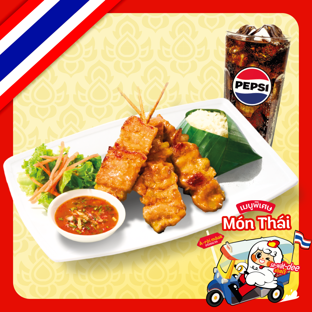 Thai sticky rice with grilled pork skewers